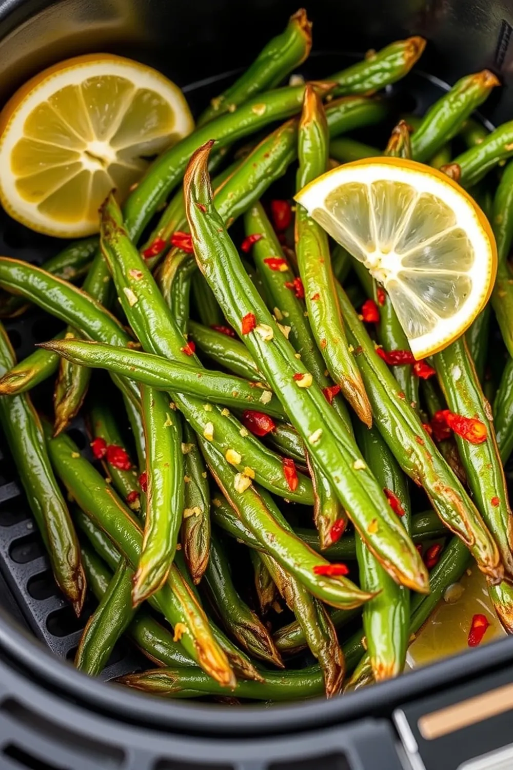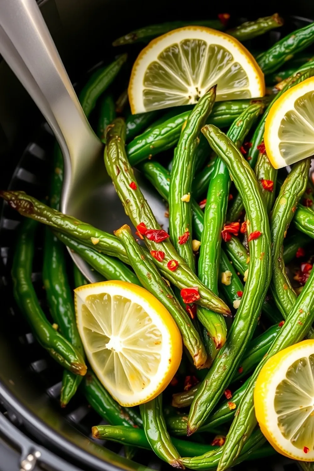 - Finally, transfer the green beans to a serving dish. Sprinkle with a pinch of red pepper flakes (if you like a little heat) and a generous squeeze of fresh lemon juice. Serve immediately and enjoy!