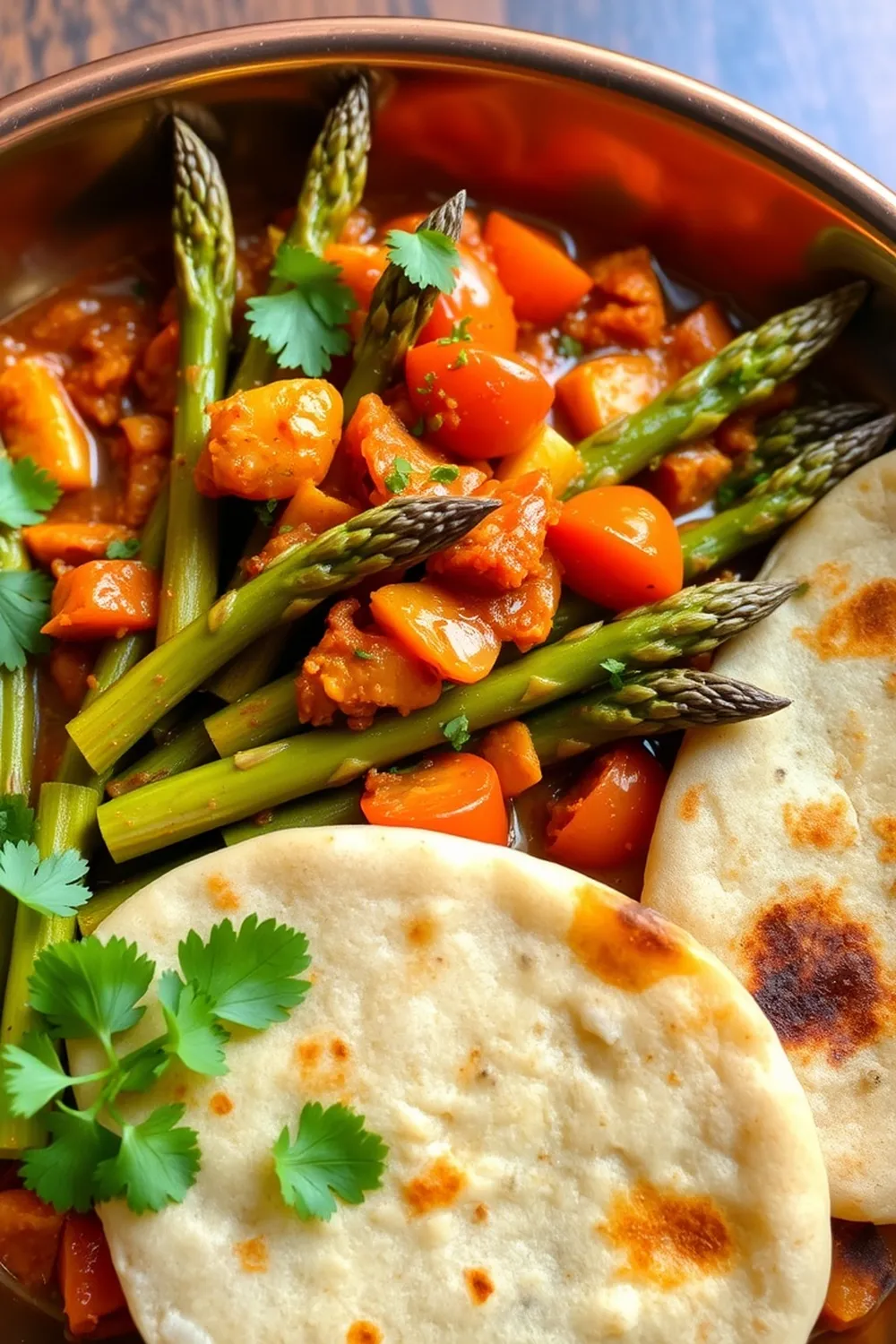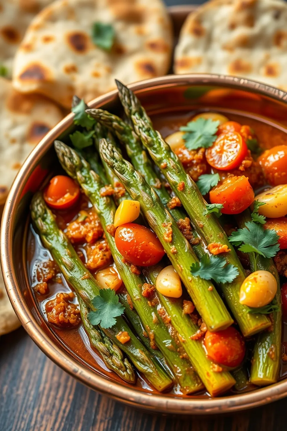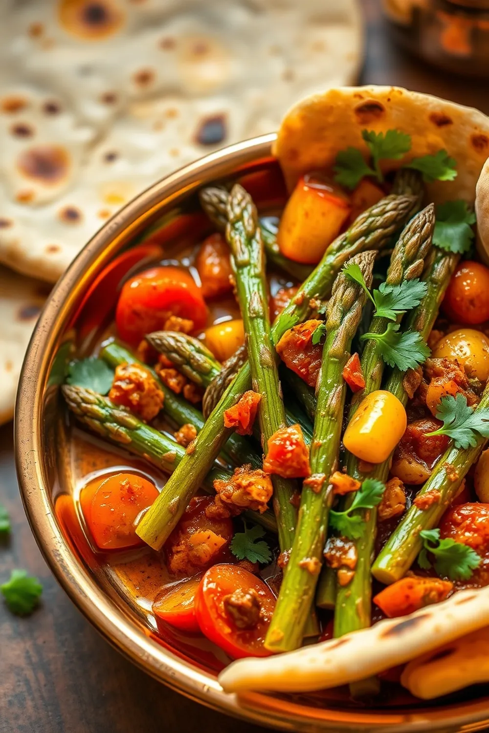 - Cook uncovered for 5-6 minutes, stirring occasionally, until the moisture evaporates and the asparagus is tender-crisp. Serve hot with your favorite Indian bread!