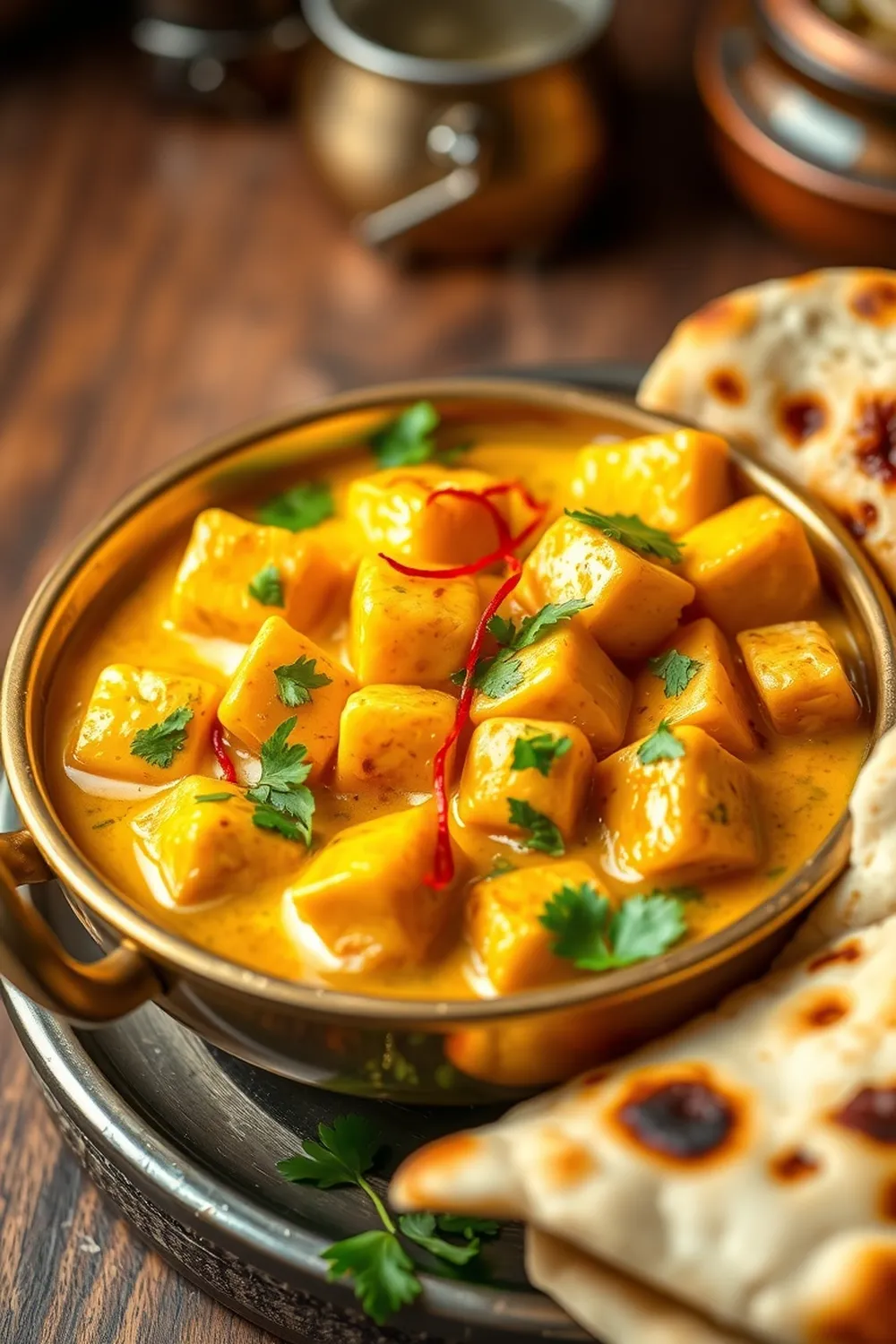 - Garnish with fresh coriander leaves or saffron strands. Serve hot with naan or rice.