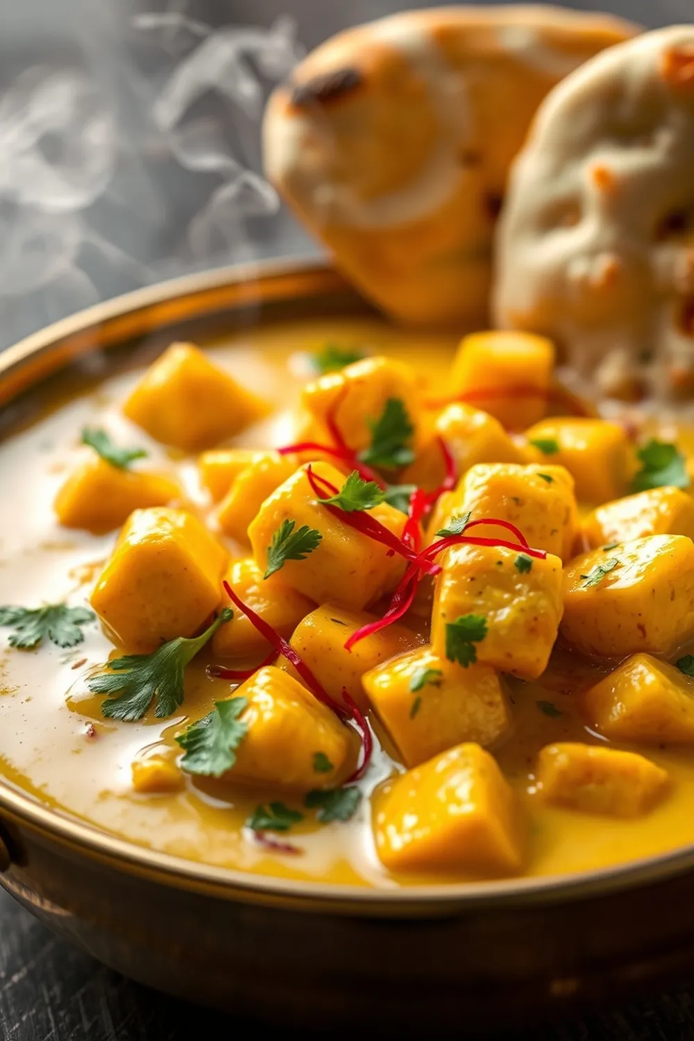 - Garnish with fresh coriander leaves or a few extra saffron strands. Serve hot with naan, roti, or rice.