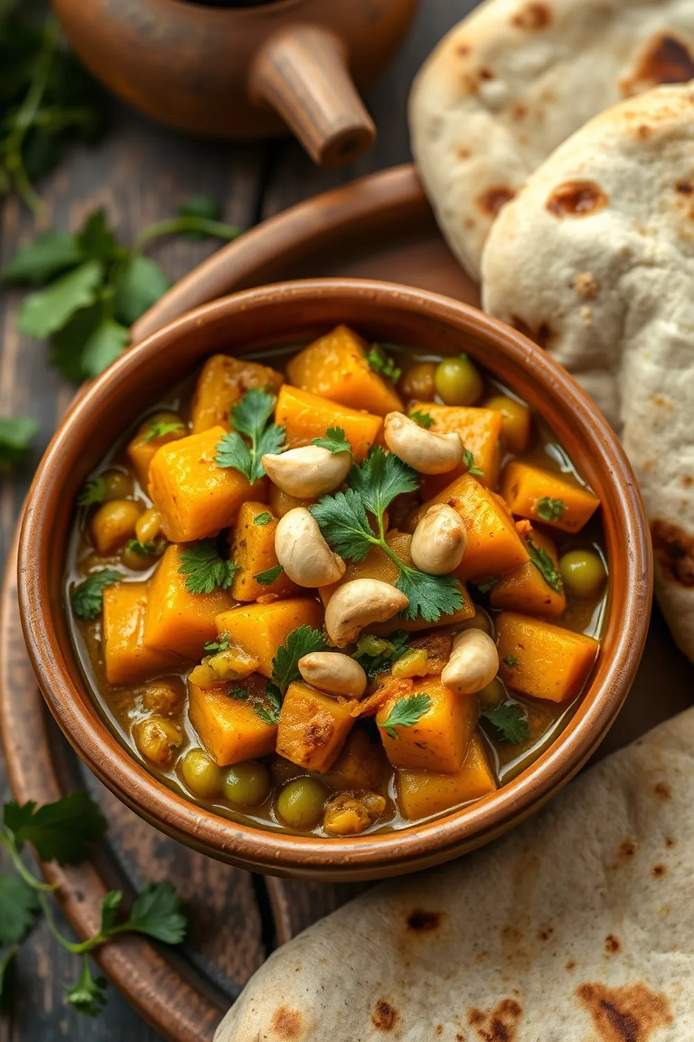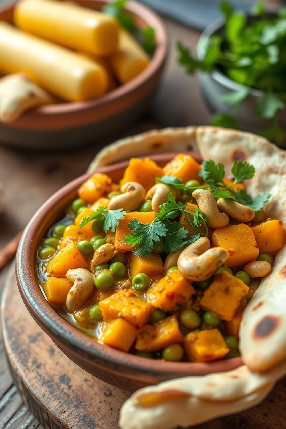 This butternut squash and pea curry is best served hot with fluffy basmati rice or warm naan bread. A side of raita (yogurt dip) can also be a refreshing accompaniment.