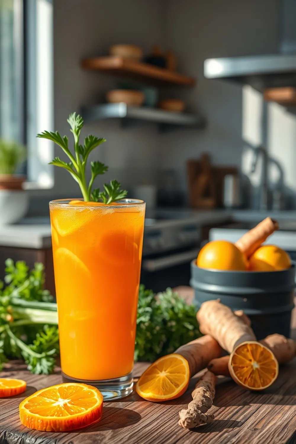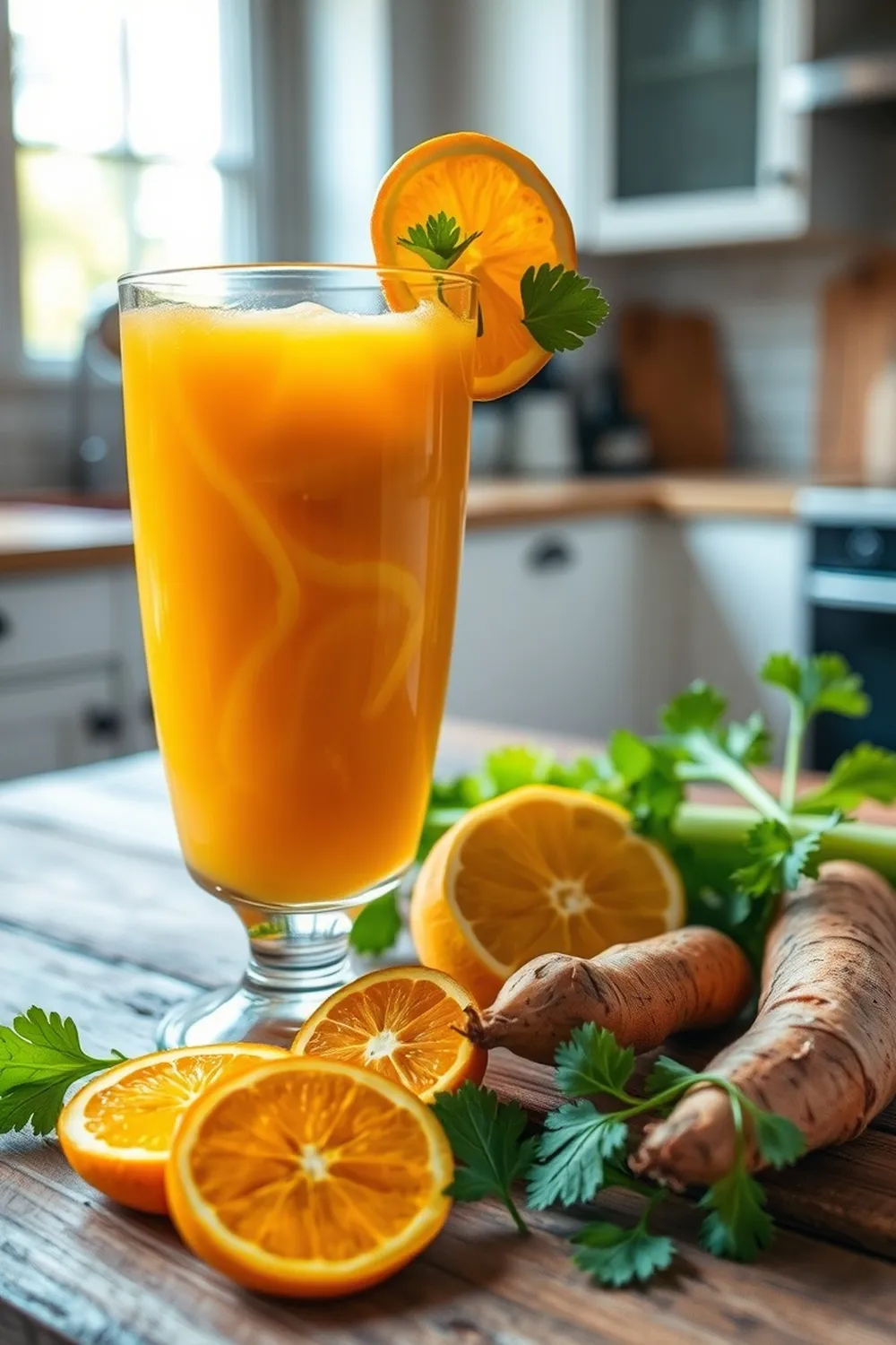 This juice is packed with vitamins, minerals, and antioxidants. Carrots are great for your eyes, oranges boost your immune system, turmeric is anti-inflammatory, and ginger aids digestion.