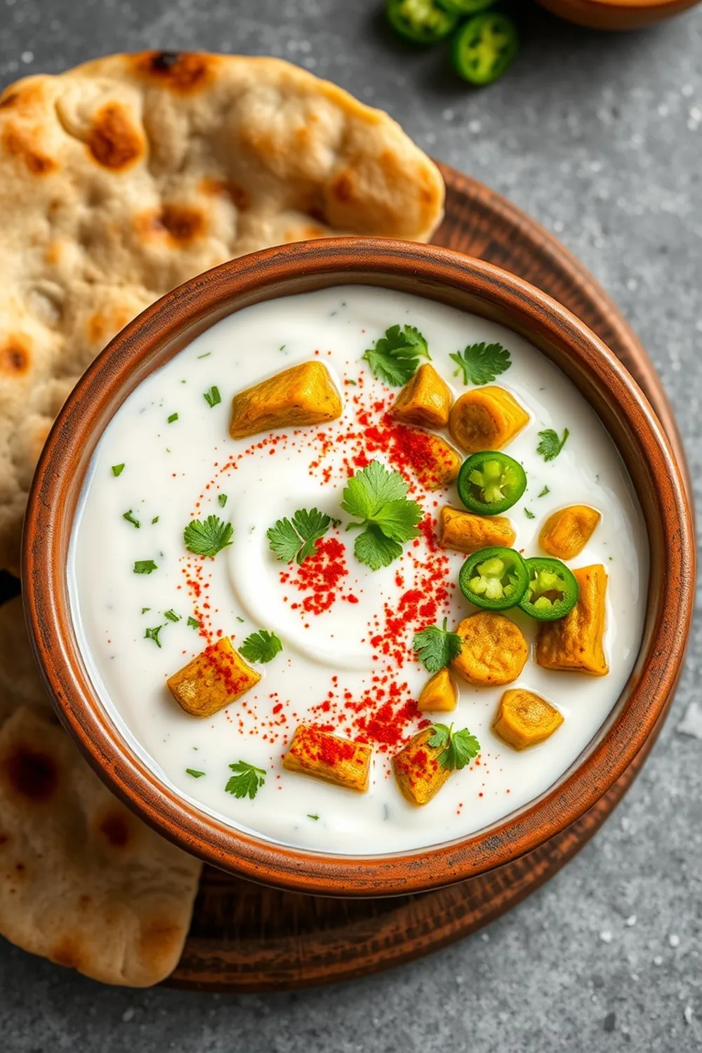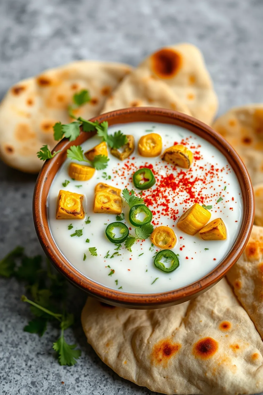 - In a serving bowl, whisk yogurt with salt, chopped cilantro, and green chilies.