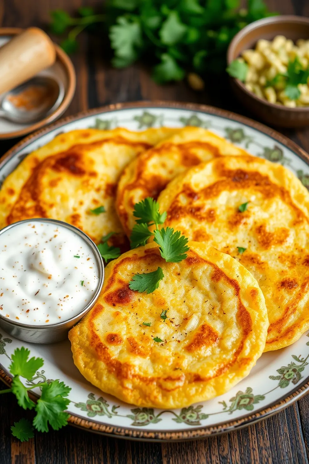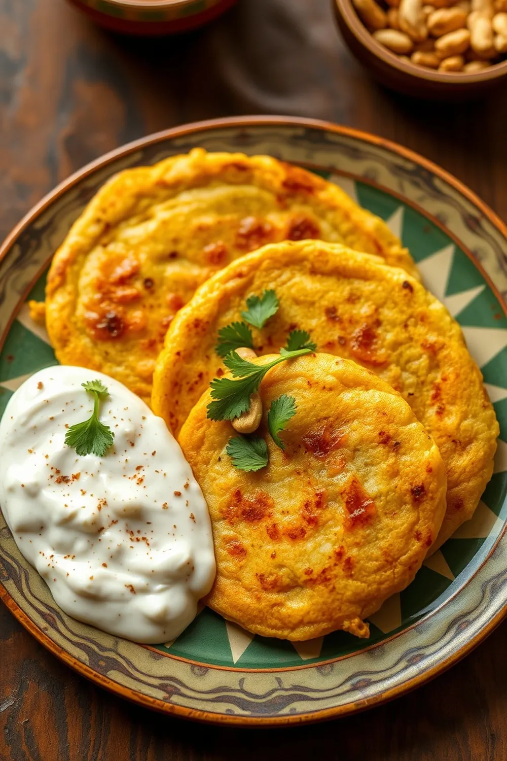 - Serve hot Dhirde with the spiced yogurt chutney.