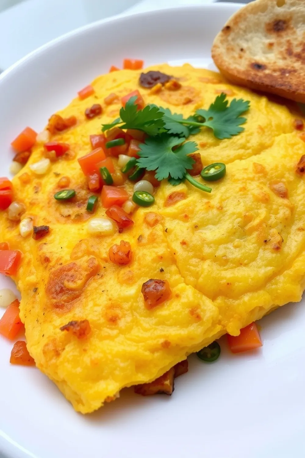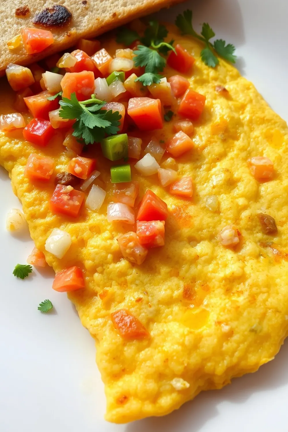 This omelette isn’t just a breakfast food – it’s a versatile, flavour-packed meal that comes together in minutes. It’s perfect for busy mornings, a light lunch, or even a quick dinner. Plus, it’s a fantastic way to sneak in some veggies! The combination of fresh vegetables, a hint of spice, and the warmth of turmeric is seriously comforting. It’s simple enough for beginner cooks, but flavorful enough to impress.