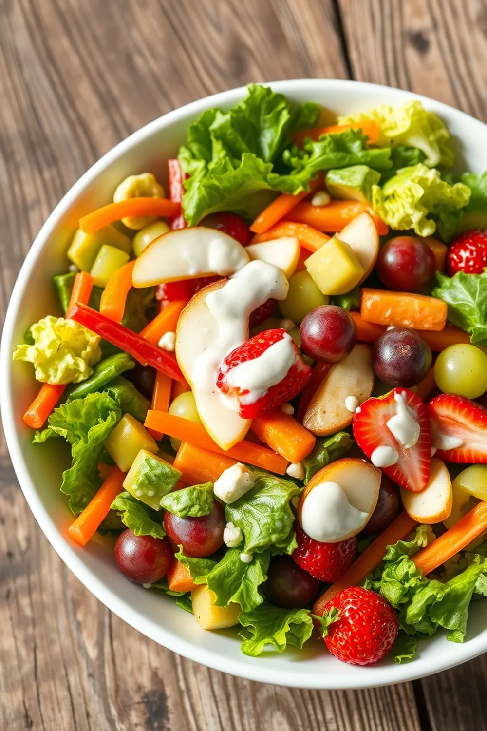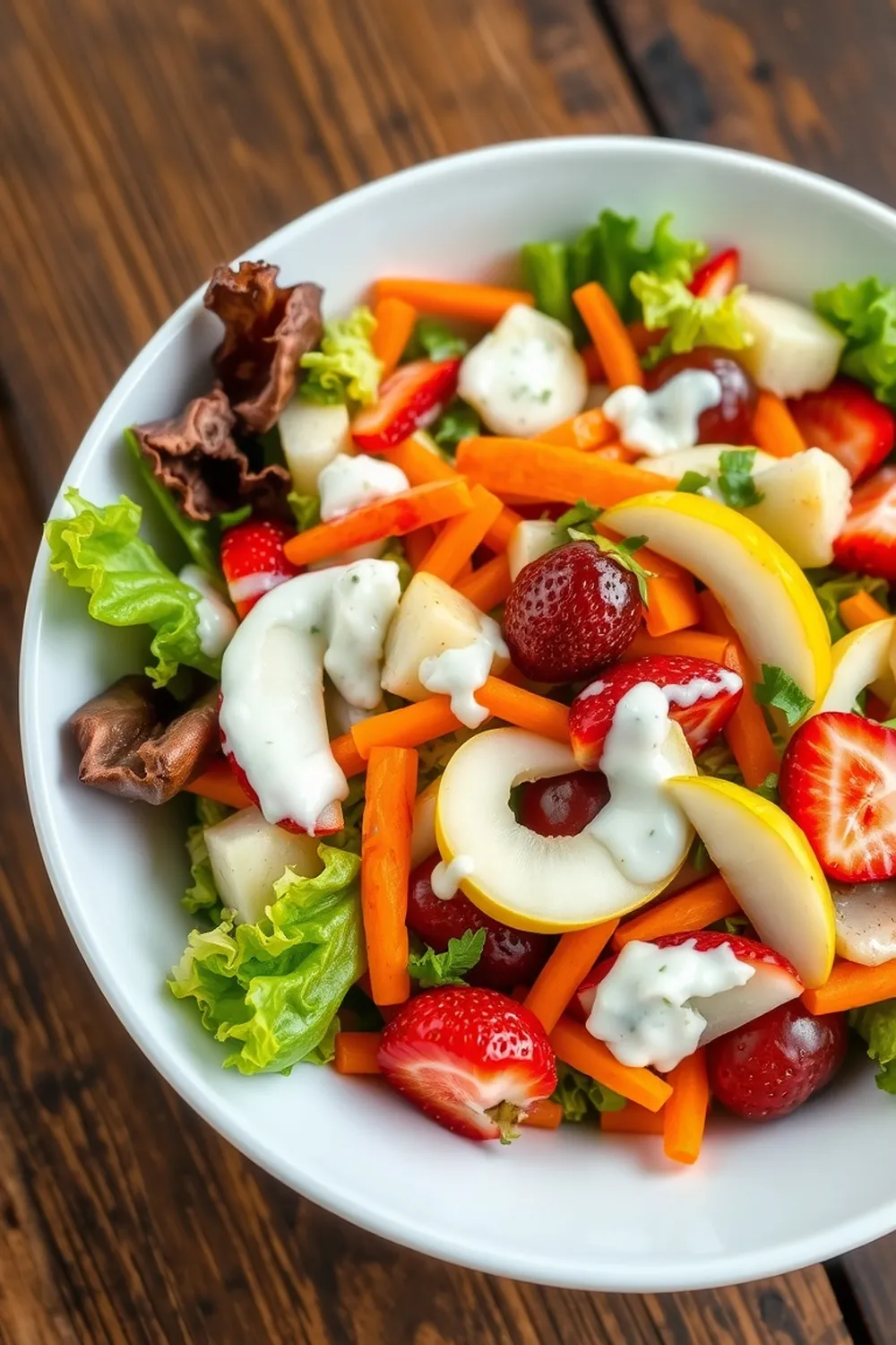 - In a large serving bowl, layer lettuce at the base. Add chopped vegetables and fruits, drizzle with ranch dressing, and gently toss just before serving.