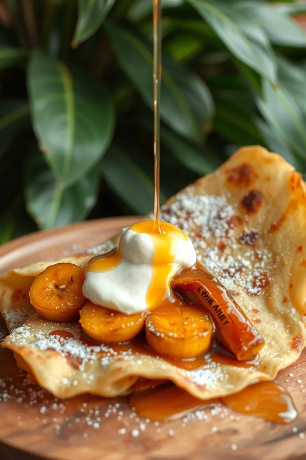 - Place a dough sheet on the skillet. Add 1 tsp oil, then layer plantains and mascarpone in the center of the dough.
