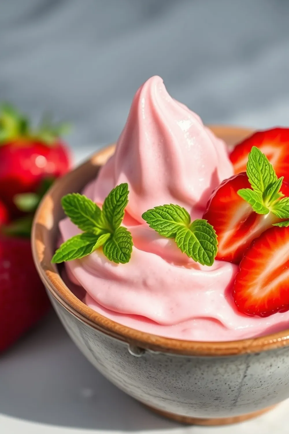 Finally, before serving, let it thaw at room temperature for about 15 minutes. Scoop into bowls, garnish with fresh strawberries, and enjoy!